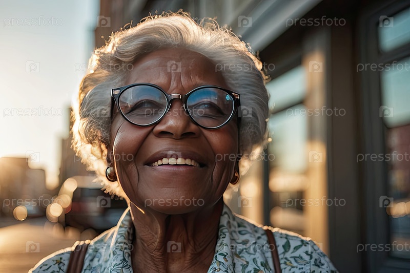 Счастливая старшая черная женщина, круглые очки, жемчужное ожерелье, узочное куртко, городской свет, улыбка. макулярная дегенерация, сухость глаза, колебания зрения, справочный пост клиники, рекламный участок для взрослых в сфере образа жизни