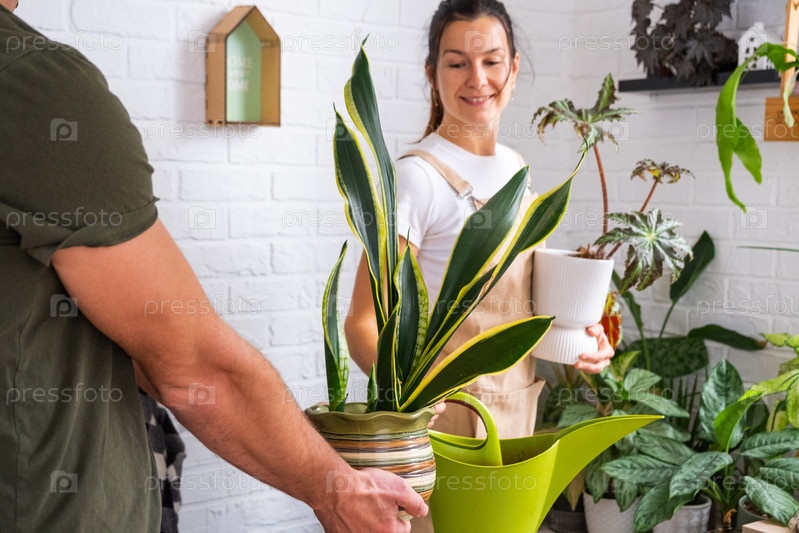 Молодая женщина и мужчина поливают сансевирию вместе в ярком доме, веселая пара наслаждается садоводством в помещении, экологически чистым образом жизни, стильным декором