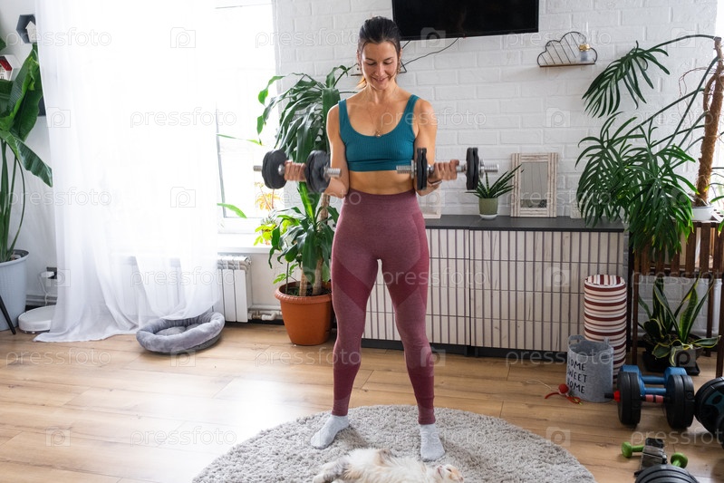 Уверенная в себе женщина позирует после тренировки дома, компаньон tabby cat расслабляется на ковре, современный фитнес-образ жизни, связь с домашним животным, энергичная рутина