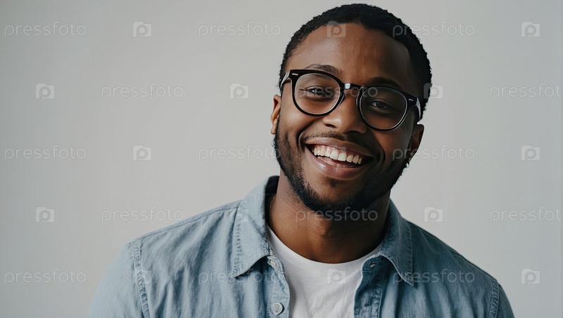 Веселый молодой чернокожий мужчина с очками, студия, длительное изучение часов, экраны, цифровая усталость, оздоровление, университетский стиль, современное образование, пространство для текста объявления