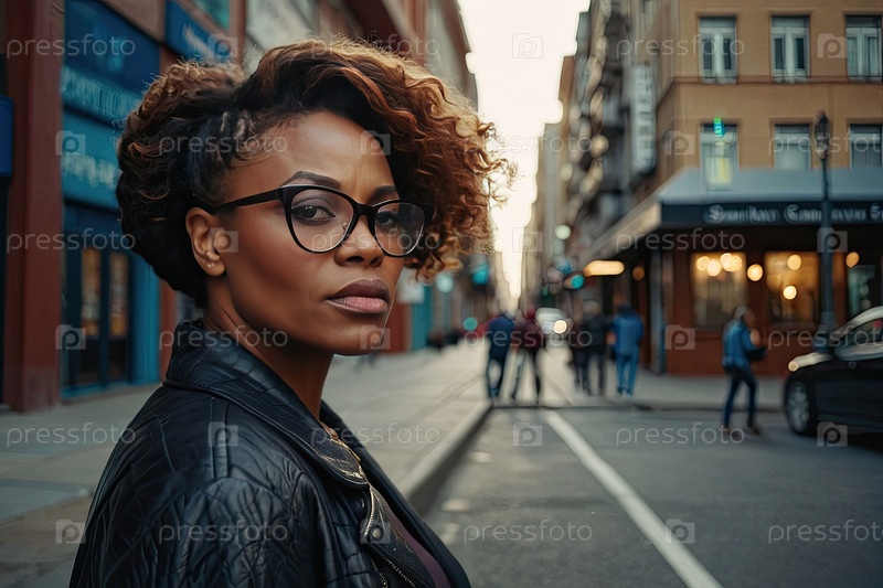 Афроамериканская женщина в очках, кожаная куртка, стоящая на городской улице, нейтральное выражение взрослого снижения зрения, модные очки, дилемма выбора, урбанистический фон, копирайтинг