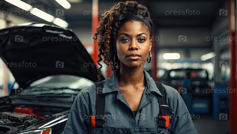 Уверенная в себе молодая афроамериканская женщина автомеханик в синей рубашке, стоящая у открытого капота автомобиля на мастерской, квалифицированный профессионал, персонал, рекламное пространство
