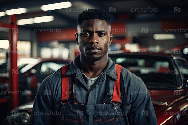 Портрет серьезного афроамериканского мужчины-автомеханика в серой форме на сервисном гараже, профессиональный технический работник, уверенность, место для текста