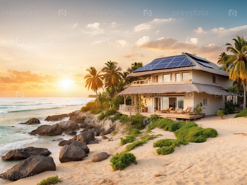 Деревянная эко-вилла с солнечными батареями, прибрежный закат, курорт солнечной энергии, устойчивый летний туризм, зеленое жилье, цифровая иллюстрация