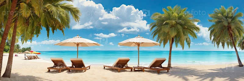 Пляжная релаксация, минимальное количество людей, легкие шезлонги, яркое солнце, реклама отдыха в курортах, туры, профилактика ожогов, использование баннеров