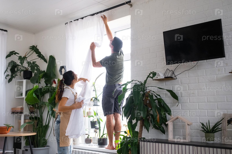 Веселая пара, работающая в команде, вешает новые шторы в солнечной квартире, весенний ремонт дома, домашнее счастье, взаимная поддержка