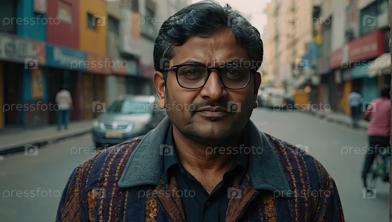 Зрелый индийский мужчина в очках, серьезное лицо, традиционная куртка, вид на улицу, размышления