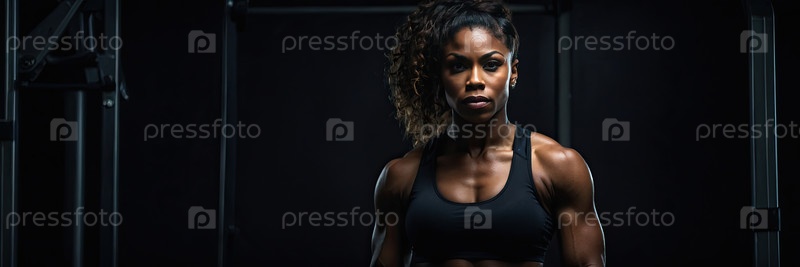 Атлетический афроамериканский женский фитнес-тренировщик в тренажерном зале, персонал, спортивная одежда, профессиональные, личные тренировки, оздоровление, портрет, текстовая область, продвижение