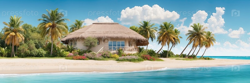 Современный бунгало у тропического пляжа, вилла "все включено", эксклюзивный летний семейный курорт, тихий отдых, цифровые мультфильмы