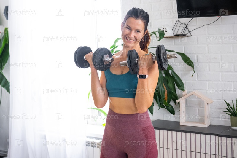 Женщина, занимающаяся с помощью весов дома, спортивный внешний вид, минимальный шикарность, растительный декор в интерьере, саморазвитие, домашняя оздоровительная зона, здоровый образ жизни