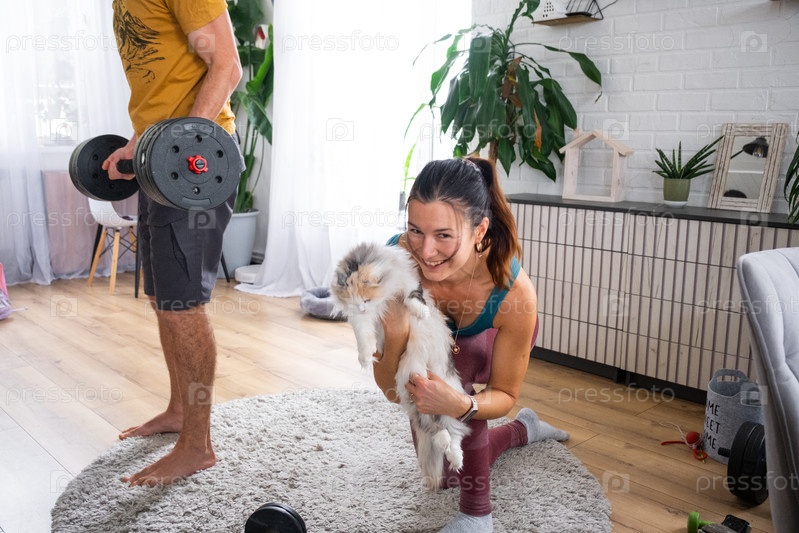 Улыбающаяся женщина обнимает ласкового кота после тренировки, мужчина поблизости, домашняя гимнастика, счастливые моменты с животными, любящее партнерство, здоровый образ жизни