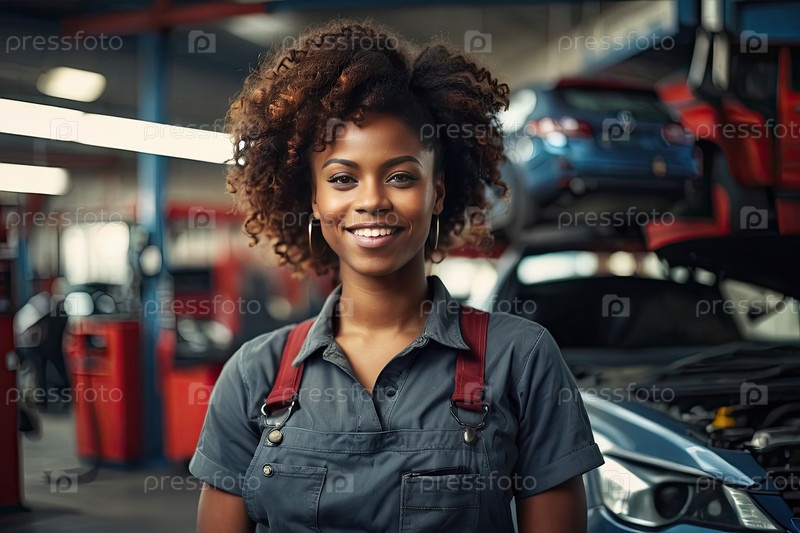 Уверенная молодая чернокожая женщина автомеханик в серой форме и красных подвесках на автосервисе, командная работа, технические навыки, портрет, фон для текста