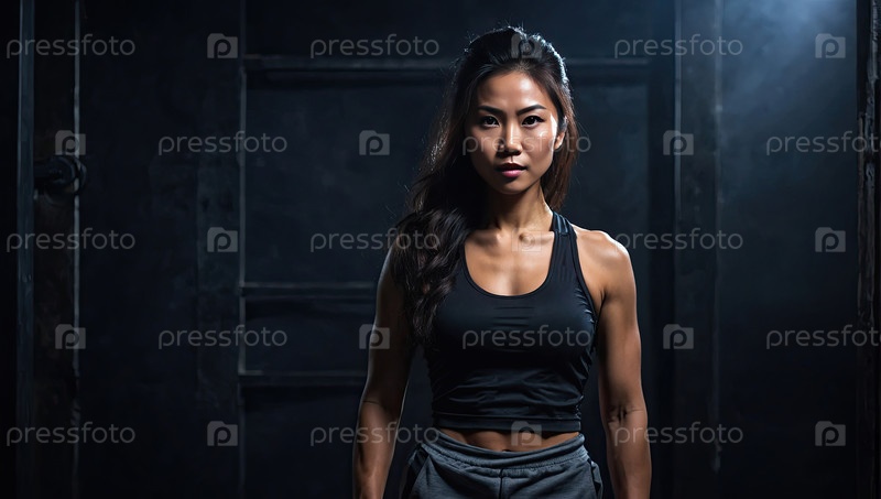 Уверенная в себе азиатская фитнес-тренера, спортсменка, стоящая в тренажерном зале, тренер клуба оздоровления, сильная, спортивная, тренировка, здоровый образ жизни, изображение персонала, место для текста