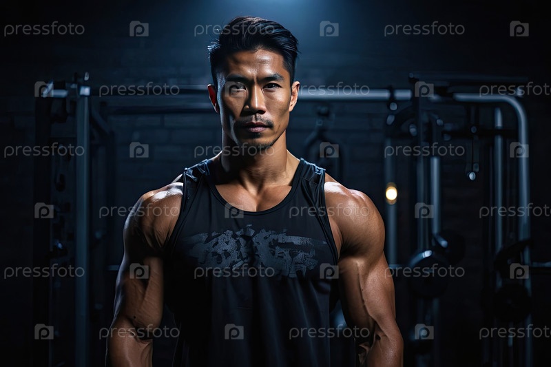 Атлетический азиатский фитнес-тренировщик, стоящий в тренажерном зале, коучинг, мотивация, портрет личной тренировки, сила, клуб пригодности, пространство для сообщения