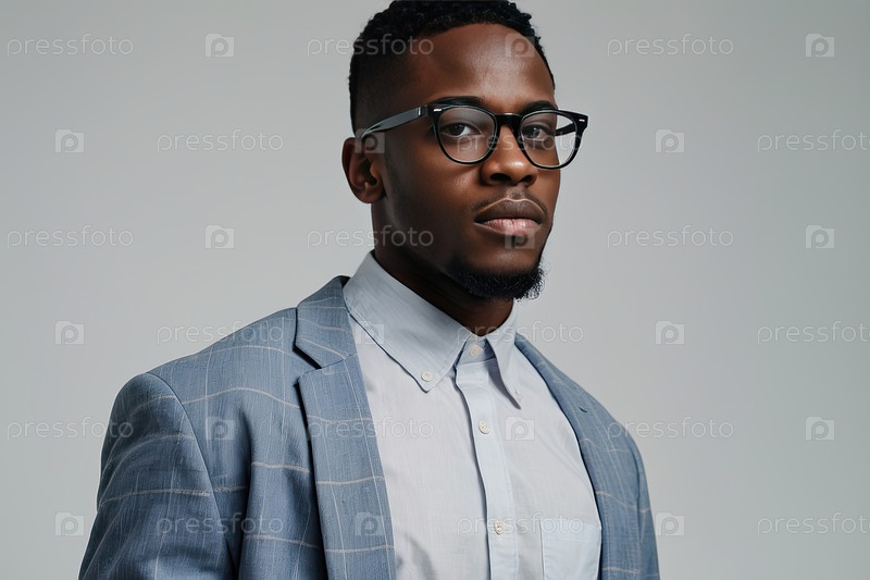 Молодой элегантный чернокожий мужчина в очках, формальный костюм, светло-серый фон, студент, цифровой образ жизни, частое время перед экраном, оздоровление, текст для поощрения