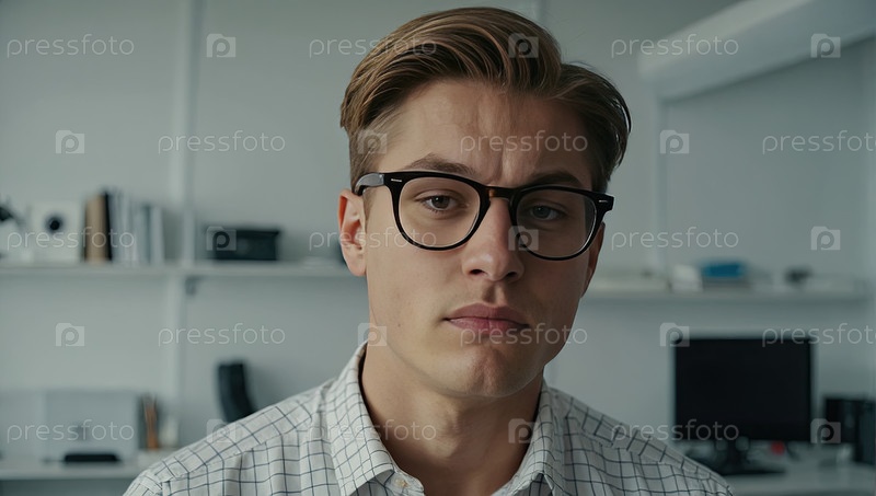 Мужчина-сотрудник в очках на чистом офисном пространстве, современная мебель, уход за зрением, здоровое рабочее место, консалтинг по очкам, отношение к производительности, концепция бизнес-консалтинга