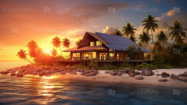 Роскошная эко-вилла на берегу океана при закате, технология солнечных панелей, устойчивый туризм, место отдыха с альтернативной энергетикой, цифровая живопись