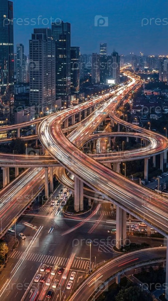 Ночной городской пейзаж современного автомагистрального перекрестка, текущие автомобильные огни, современная городская жизнь, кривая скоростной дороги, центр столичного района города, инфраструктура