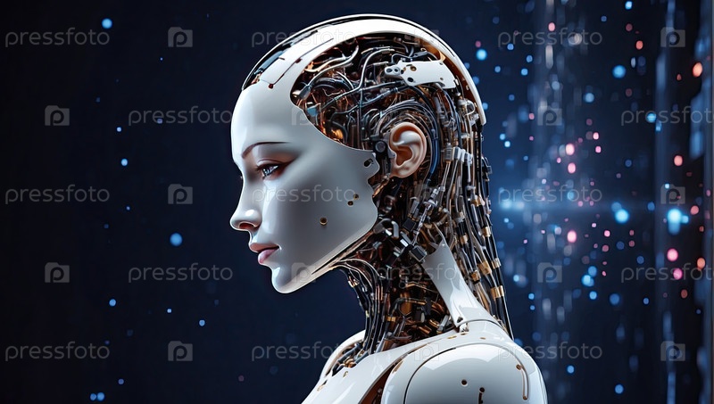 Кибернетический женский робот в боковом профиле с синим технологическим светом, футуристический ИИ, наука и технология, пустое место для текста на правом краю