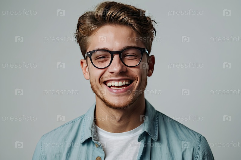 Счастливая молодая кавказская студентка в очках, серый фон, советы по здоровью глаз, образ жизни цифрового обучения, городские тенденции, поощрение, место для текста объявления