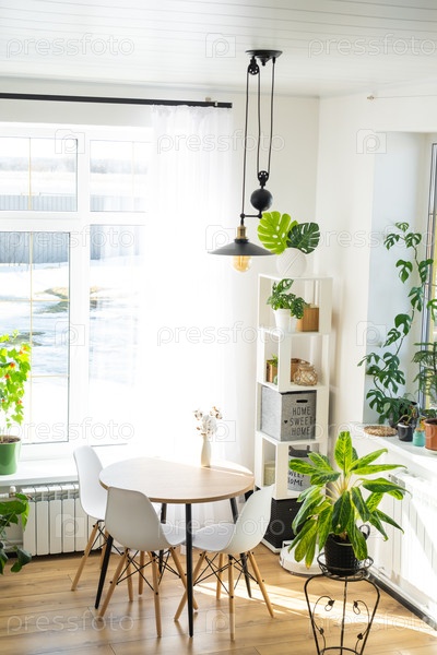 Круглый стол, два стула, горшочные растения, большие окна, легкий минимализм, свежий внешний вид, простая элегантность, продвижение городской квартиры, мягкие шторы, чистое оборудование