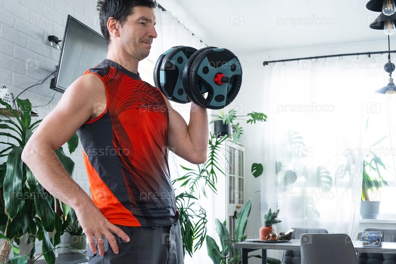 Мужчина поднимает штангу дома, красный спортивный верхний слой, стильная современная комната, фитнес-фокус, здоровая жизнь, рутина тренажерного зала, ежедневная практика, спортивное проживание, зона оздоровления