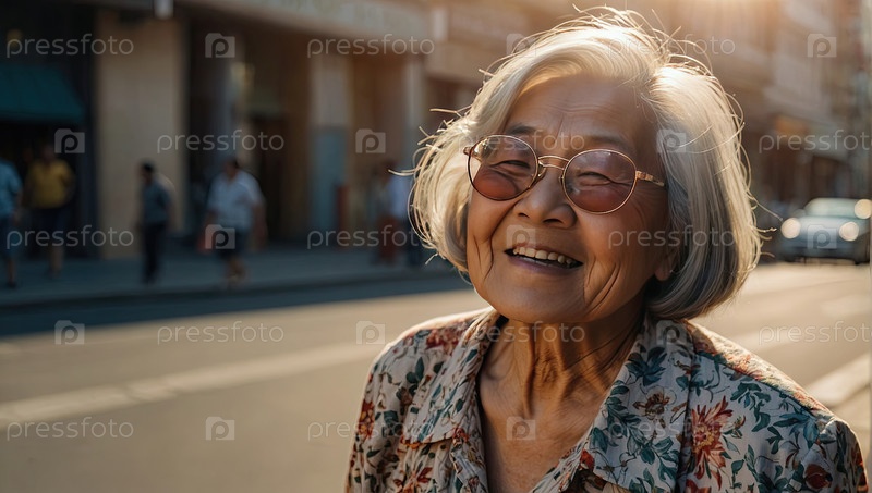 Смеющаяся пожилая леди, сверхразмерные круглые очки, серебристые кудрявые волосы, цветущий шарф, улица заката. Катаракта, возрастная потеря зрения, сухость глаз, позитивное отношение, социальный пост, текстовое поле медицинского дела