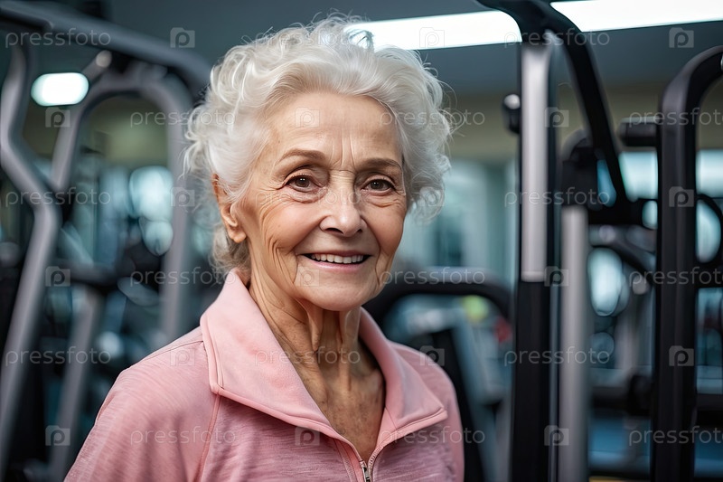 Кавказская пожилая женщина, около 75 лет, в розовой спортивной рубашке, тренажерный зал, оздоровление, фитнес, здоровое старение, улыбка, редакция, медицина, реклама, текст для промо
