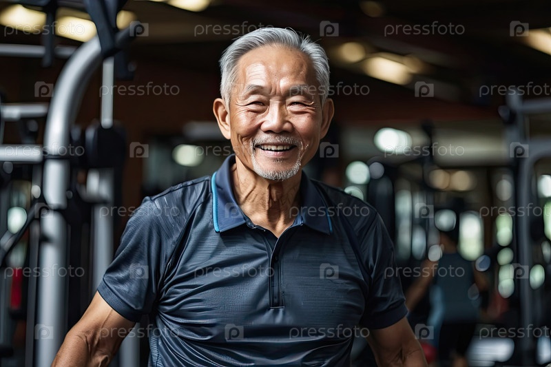 Пожилой азиатский мужчина, 75 лет, фитнес-клуб, черное спортивное поло, тренажерный зал, здоровый, оздоровление, улыбающийся, старший фитнес, образ жизни, реклама, редакция