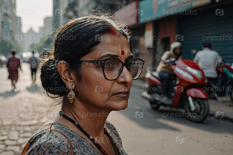 Женщина из Южной Азии в очках, волосы привязанные к спине, боковой профиль возле городской стены, спокойное выражение лица, уменьшение зрения взрослых, поиск очков, текстурированный фон, копирайтинг
