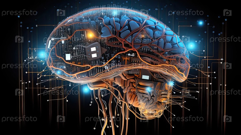 Абстрактный голубой золотой мозг ИИ с цифровой проводкой, технологией нейронных сетей, творчеством, инновациями, исследованиями в области когнитивных вычислений и систем обработки данных