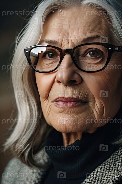 Зрелая белокожая женщина в коричневых модных очках, волнистые блондинки, белый пиджак, закрытый макияж лица, свет квартиры. пресбиопия, непрозрачность роговицы, изменения сетчатки глаза, уверенность старшего поколения, блок информации о здоровье