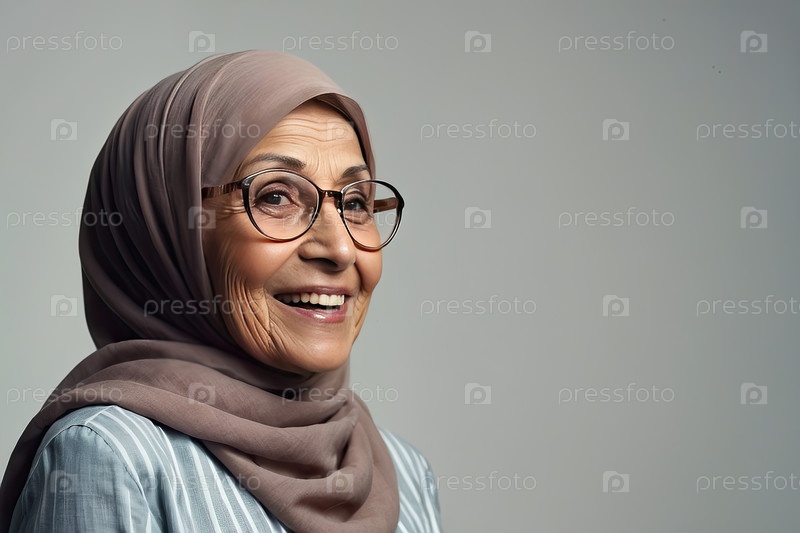 Портрет улыбающейся арабской женщины в коричневом хиджабе и очках с пространством для текста, коррекции зрения, здоровья, уверенности, концепция профессиональных очков