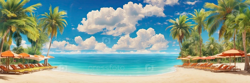 Спокойное голубое море, пальма, два шезлонга, комфорт и спокойствие, пляжный отдых, роскошный опыт, место для заголовка или текста объявления вверху или справа