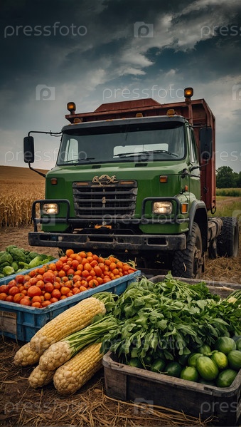 Зеленый грузовик и коробки с овощами на ярмарке ? урожай частной фермы, полевое мероприятие, осенний рынок, экопродажа, праздник, баннер для празднования плакат или местный бизнес