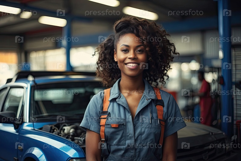 Портрет молодой чернокожей женщины-автомеханика с кудрявыми волосами в синей форме на автомастерской, дружелюбная, техническая профессия, гендерное разнообразие, копировальное пространство