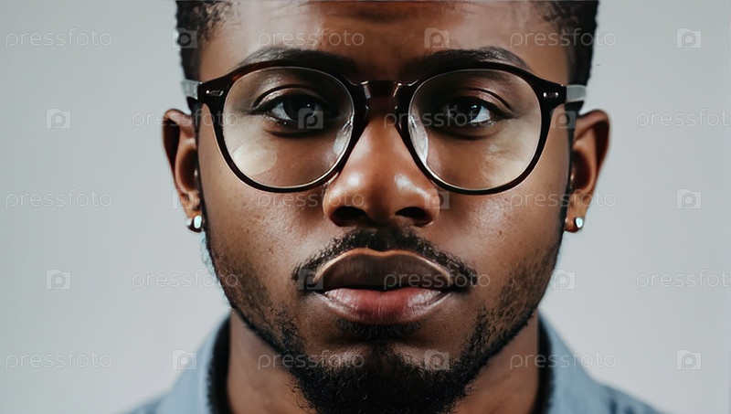 Улыбающийся афроамериканец, очки, серый фон студии, уход за зрением студентов, усталость от экрана компьютера, цифровой университетский тренд, поощрение, текстовое пятно