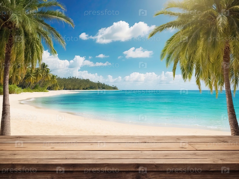 Вид на курорт с деревянным подиумом, пляжный отдых, маркетинг на берегу моря, фон для рекламы продуктов питания или напитков, пустое пространство для сообщения