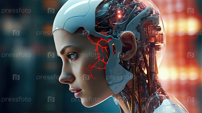 Закройте женское лицо андроида с кибернетическими элементами, оранжевым городским световым боке, футуристической и интеллектуальной концепцией, оставьте место для текста или логотипа