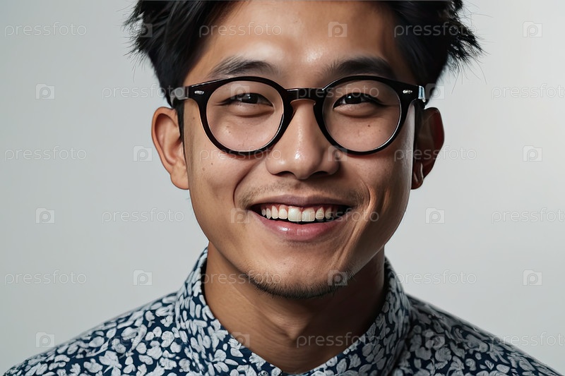 Улыбающийся молодой азиатский мужчина в очках, рисунковая рубашка, серый фон, студент, улучшение зрения после смены скрин-привычек, оздоровление, поощрение, зона текста