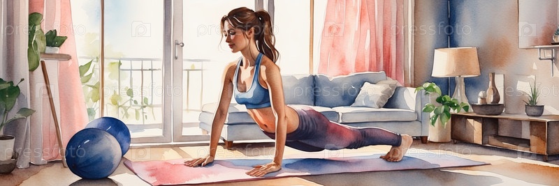 Акварельная иллюстрация домашнего фитнеса, девочка занимается с мячом, здоровый образ жизни, удобство, оздоровление, идеально подходит для блогов, объявлений, баннеров, материалов по оздоровлению