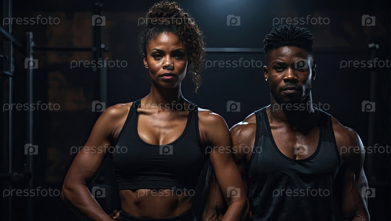 Афроамериканские мужчины и женщины личные тренеры, фитнес-клуб, портрет спортивной группы, спортивная одежда, команда персонала, профессионалы, коучинг, мотивация, промо