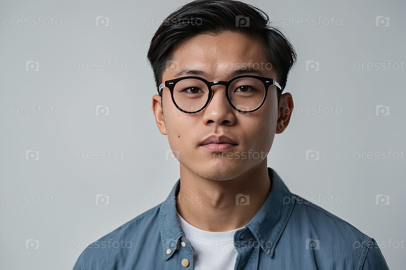 Улыбающийся азиатский студент-мужчина в очках, портрет студии, усталость зрения от работы на компьютере, технически подкованный академический стиль, советы по здоровью глаз, пространство для текста объявления