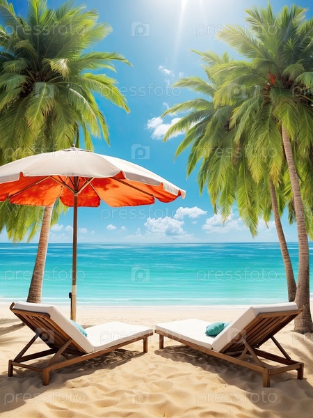 Пляжный закат с двумя шезлонгами, оранжевый зонтик, романтический отдых, веселый досуг, летняя реклама, пустая песчаная зона для промо текста