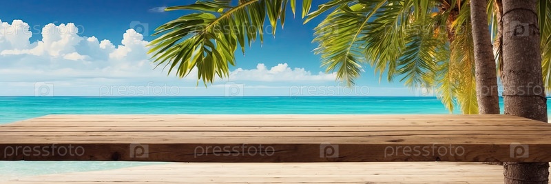 Длинная деревянная поверхность, летний туризм, баннер продукта, коммерческий рекламный фон, горизонтальный макет объявления, пространство для слогана или предметов
