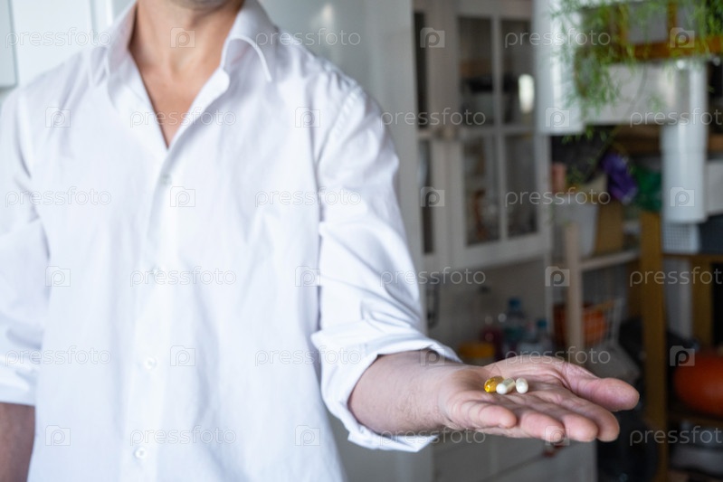 Мужчина, принимающий витамины, мужское здоровье, диетические добавки для мужчин, повышение иммунитета, витамины для энергии, объявление о витаминных брендах, промо в аптеке