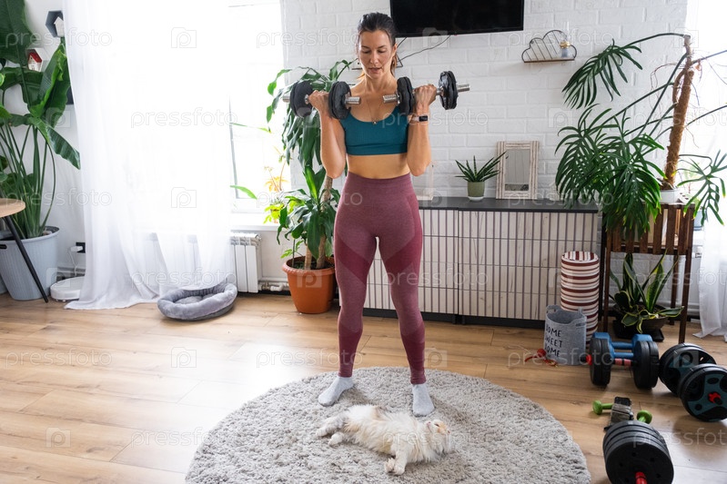 Женщина в спортивной одежде, улыбающаяся после домашней тренировки, милая кошка Табби отдыхает на ковре, здоровый образ жизни, компания питомца, веселый образ жизни