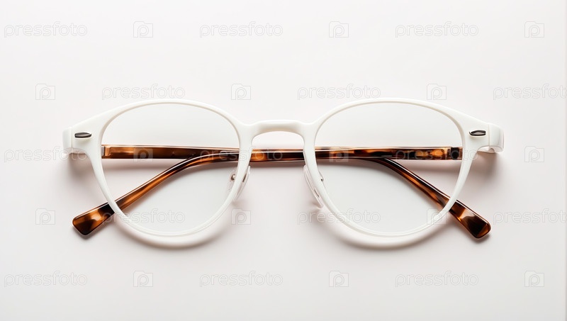 Современные очки с белой прозрачной рамой на ярком фоне, минималистская плоскость, летняя оптическая мода, реклама профессиональных очков с текстовой зоной