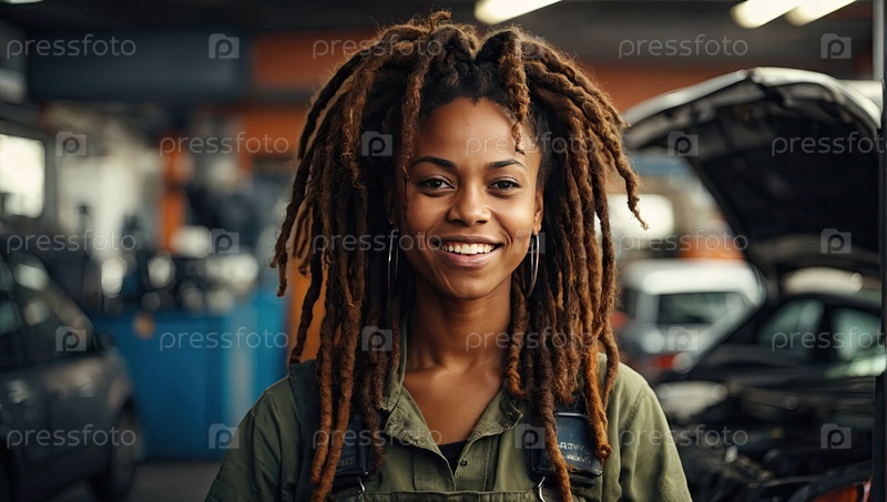 Портрет улыбающейся чернокожей женщины-механика в сером цвете на автомастерской, технический специалист, расширение прав и возможностей женщин, copyspace
