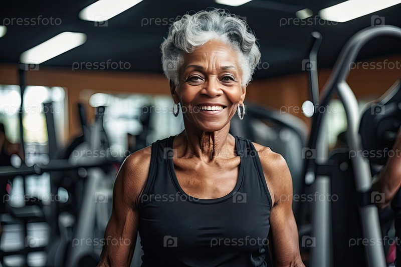 Афроамериканская женщина старшего возраста около 70 лет, в форме, в спортивном топе, фитнес-центре, улыбаясь, здоровье, оздоровление, активное старение, редакционное, медицинское, рекламное использование